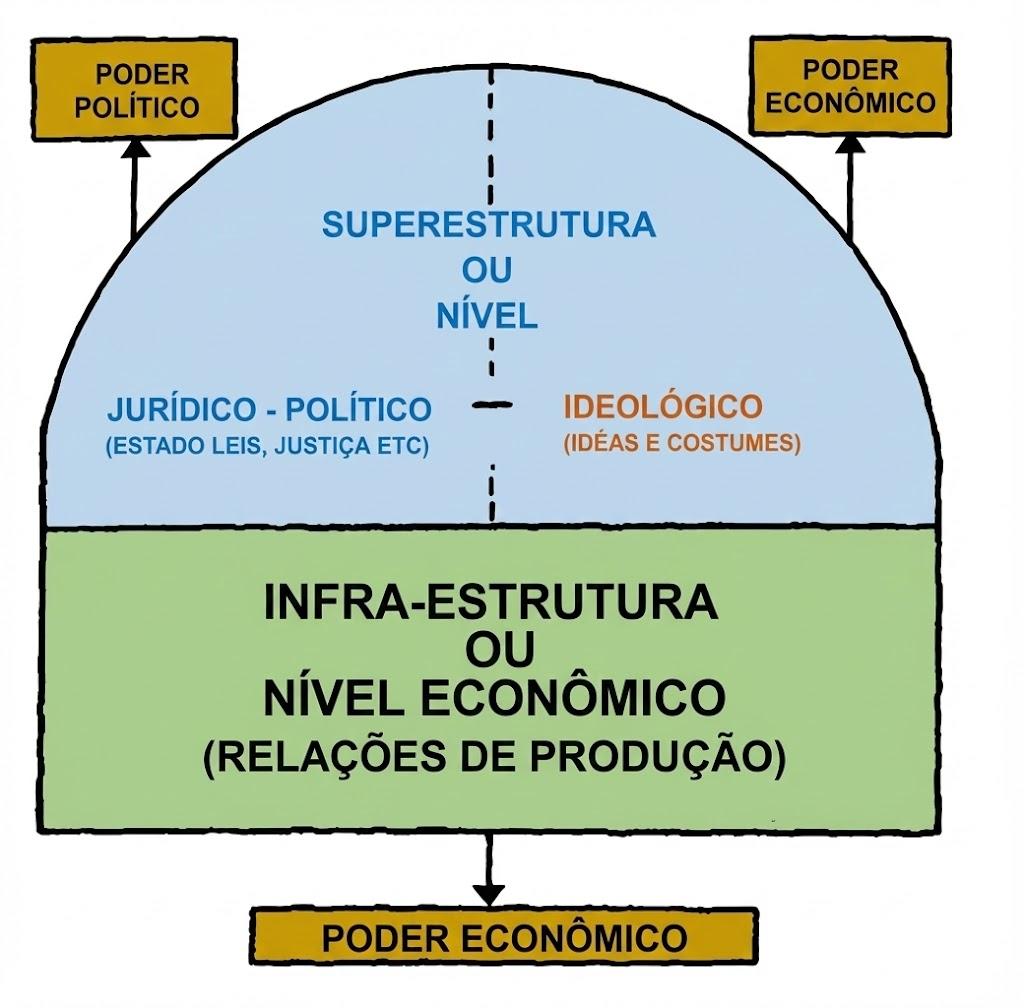 Por isso chamaremos “infra-estrutura” o nível econômico. O outro nível, formado por elementos jurídico-políticos (Estado, direito, etc.) e ideológicos (idéias e costumes sociais), chamaremos “superestrutura”.