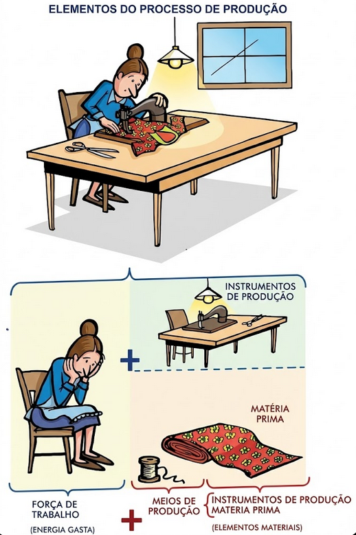 A análise de todos estes conceitos permite-nos chegar à conclusão de que os elementos fundamentais de todo o processo de produção são a força de trabalho do homem e os meios de produção. Estes elementos encontram-se presentes tanto no trabalho realizado pela nossa costureira, como no trabalho realizado na grande indústria moderna.