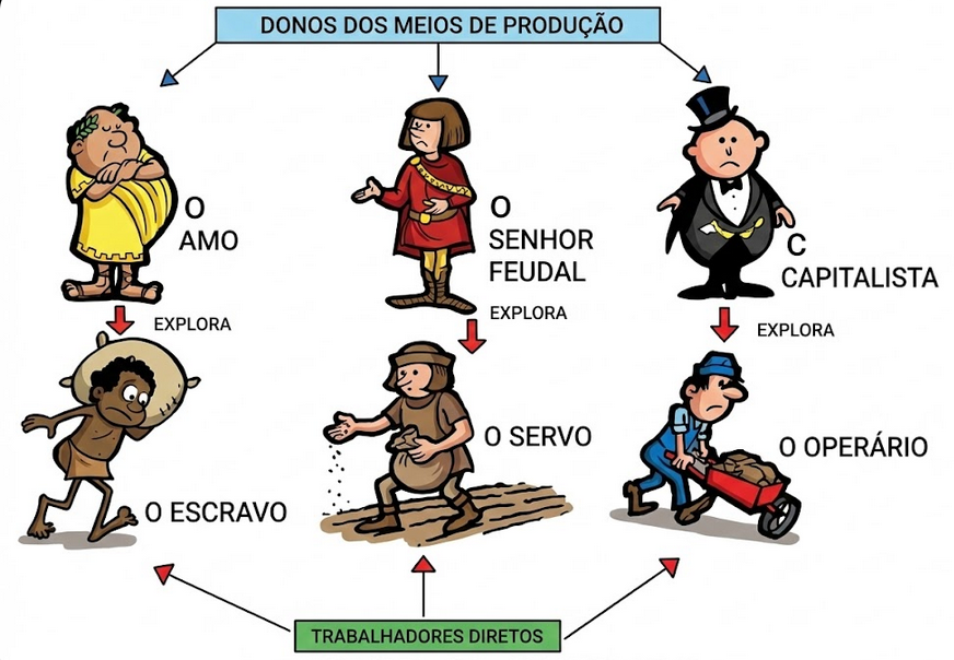 A relação explorador/explorado existe quando os proprietários dos meios de produção vivem do trabalho dos produtores diretos. As principais relações de exploração são: as relações escravistas, nas quais o amo é não só proprietário dos meios de produção como também da própria pessoa do escravo e, portanto, da sua força do trabalho; as relações servis, (feudais) nas quais o senhor é o proprietário da terra e o servo depende dele e deve trabalhar gratuitamente para ele durante um certo número de dias por ano; e por último, as relações capitalistas, em que o capitalista é o proprietário dos meios de produção e o operário deve vender a sua força de trabalho para poder viver.