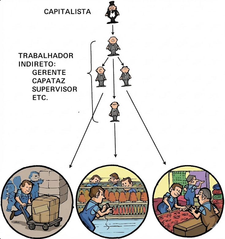 Usaremos o termo trabalhadores indiretos para nos referirmos a estes trabalhadores que estão colocados na fábrica entre os operários e o patrão.